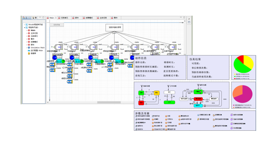 采用多智能体建模的方法进行仿真建模,建立相控阵天线整体结构的可靠性、维修性、保障性仿真模型,即用智能体建立反应系统与部件基于任务的可靠性逻辑关系的仿真模型,其模型中同时包含维修与保障机制。本模型以部件的故障规律分布为输入,通过仿真,输出系统级的平均故障间隔时间、平均致命故障时间、任务可靠性等可靠性评定参数,从而对相控阵雷达系统进行分析与决策。
